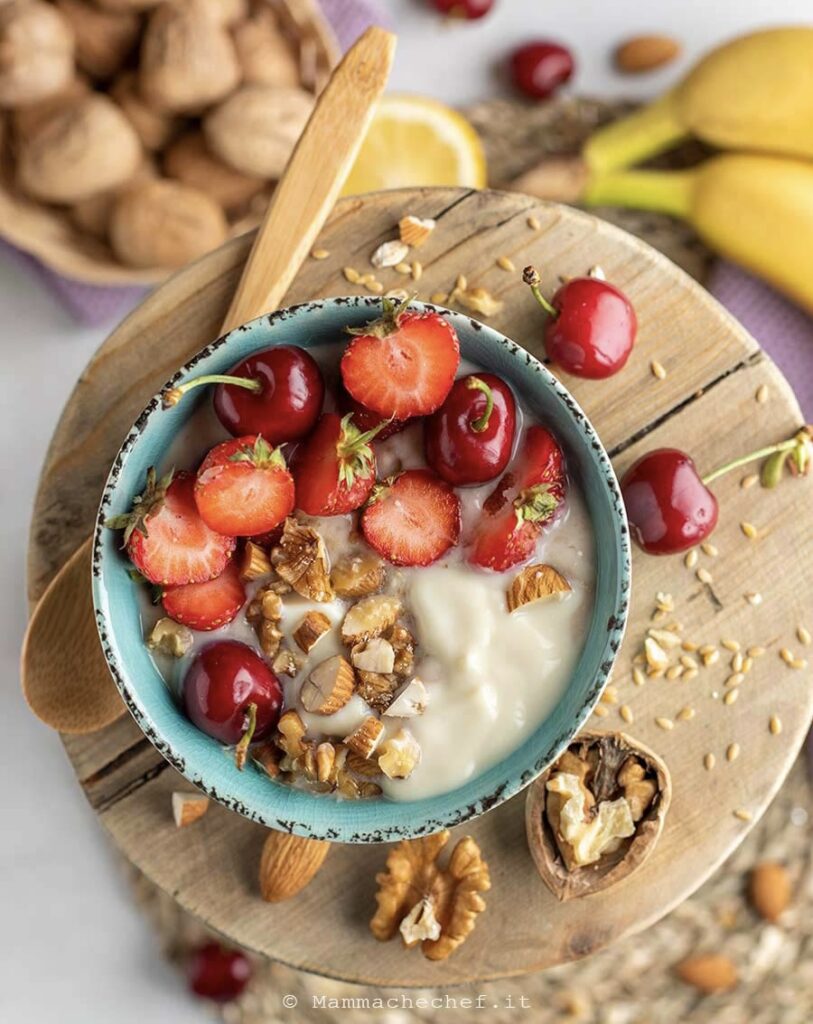 Tagliata la frutta, aggiungerla al composto precedentemente creato e mescolare. A questo punto aggiungere anche i semi e la frutta secca. Mescolare e infine, aggiungere lo yogurt.