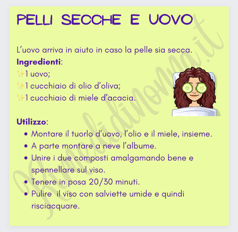 Miele e uovo – ottima in caso di pelle secca, purifica dalle impurità e allevia le borse sotto gli occhi. Mescolare un tuorlo d’uovo e un cucchiaino di miele; applicare il composto su viso e collo per 30 minuti. infine risciacquare.