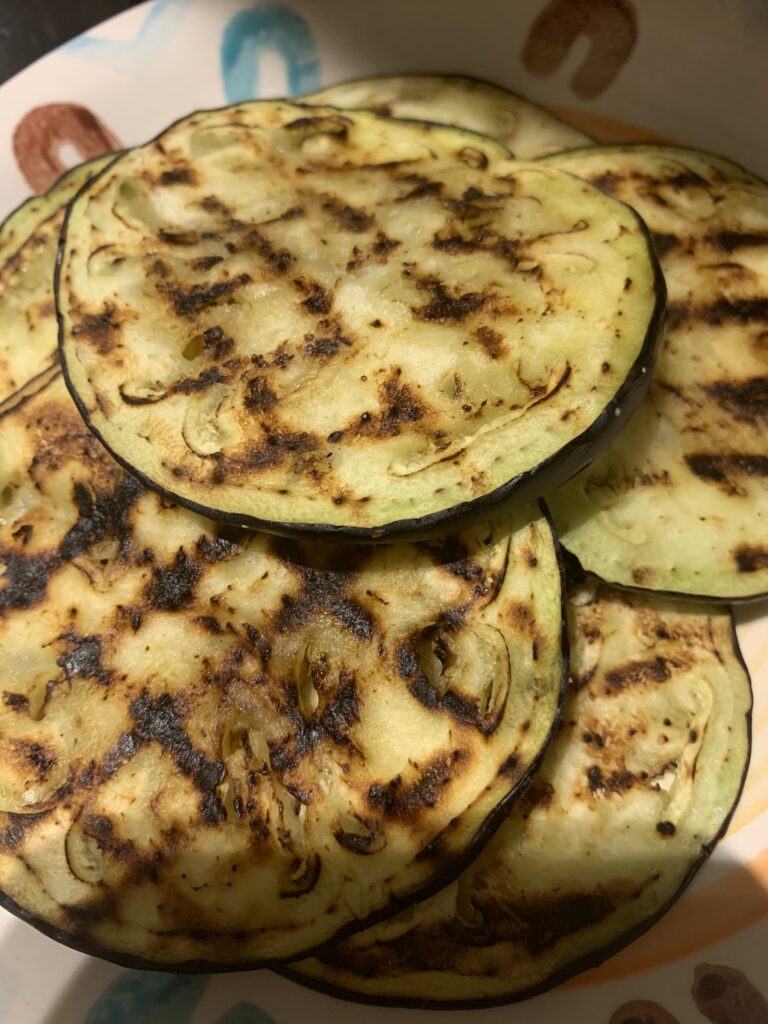 Spennellare con l’olio le fette di melanzane, condirle con un pizzico di sale e grigliarle per 3 minuti per lato sulla piastra ben calda.