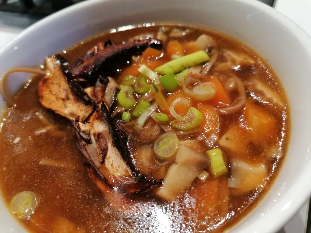 prendere una bella ciotola, riempila con l’inebriante zuppa di miso, adagiare sulla superficie i funghi caramellati nella salsa di soia e guarnire con anelli verdi di cipollotto.
